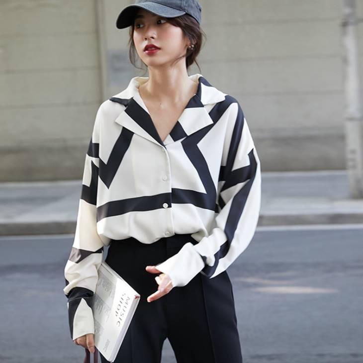 オールシーズン シャツ オフィスカジュアル 通勤服 20代 楽ちん サラッと着れる 幾何学模様 モノトーン クール Tk47 Top Mode
